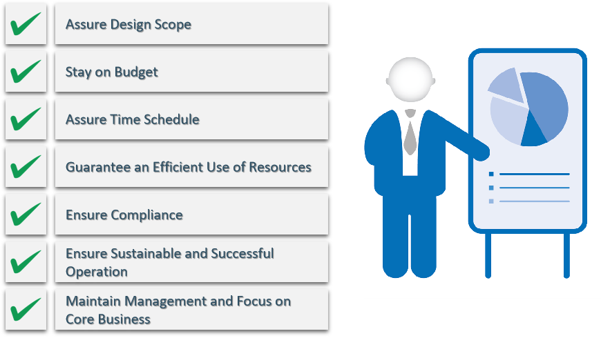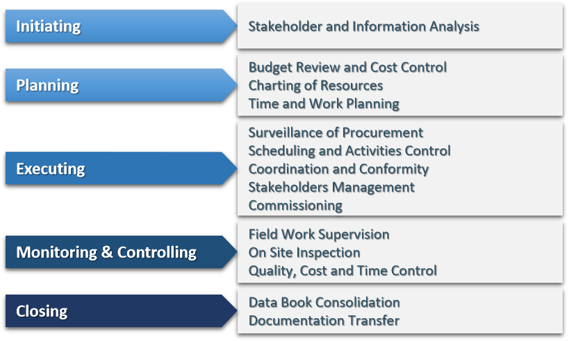 Performance of project management services on behalf of the client either being integrated into the client’s team, or executing individual services, as a full or part range packages. This includes but not limited to, contract, project controlling, engineering supervision, supply chain management support, construction supervision, supervision during commissioning and claim and risk management.